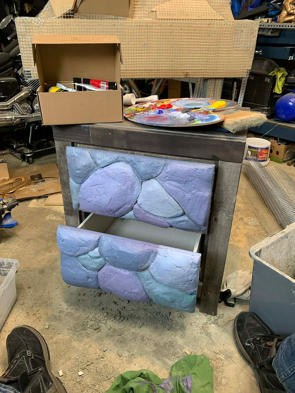 I loved this part. Both creative and intuitive, forming the rock shapes. By the next day I came back and found that the cement was hard as a rock (pun intended). I sat down and spent a good portion of the morning painting it.